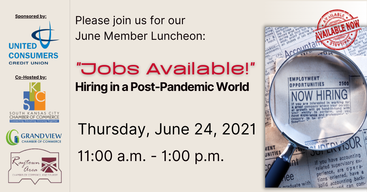 The South KC, Grandview, and Raytown Chambers of Commerce invite you to join us in-person at Faulkner’s Ranch for our luncheon to hear from Julie Anderson with Omni Human Resource Management as she talks about hiring in a post-pandemic world.